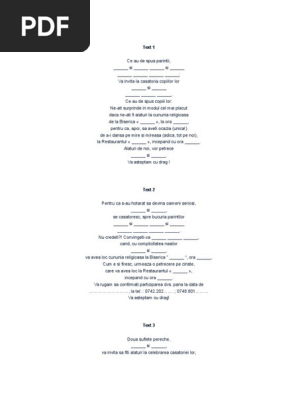 Alege cel mai potrivit text pentru invitatia ta. In continuare aveti 42 de texte de invitatii care sa va inspire si sa va ajute sa alegeti impreuna cea mai buna varianta pentru nunta voastra. Uniunea civila dintre mire si mireasa la adresa ora.